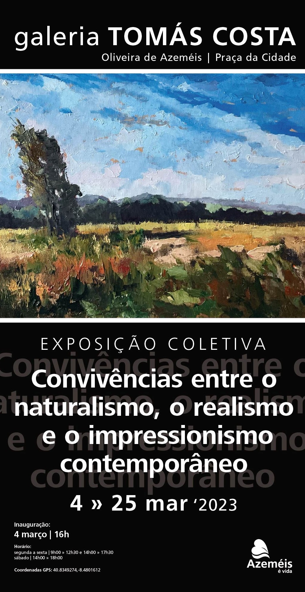 No próximo dia 04 de março, pelas 16H00, é inaugurada na Galeria Municipal Tomás Costa a exposição de pintura “Convivências entre o naturalismo, o realismo e o impressionismo contemporâneo”, uma exposição coletiva.