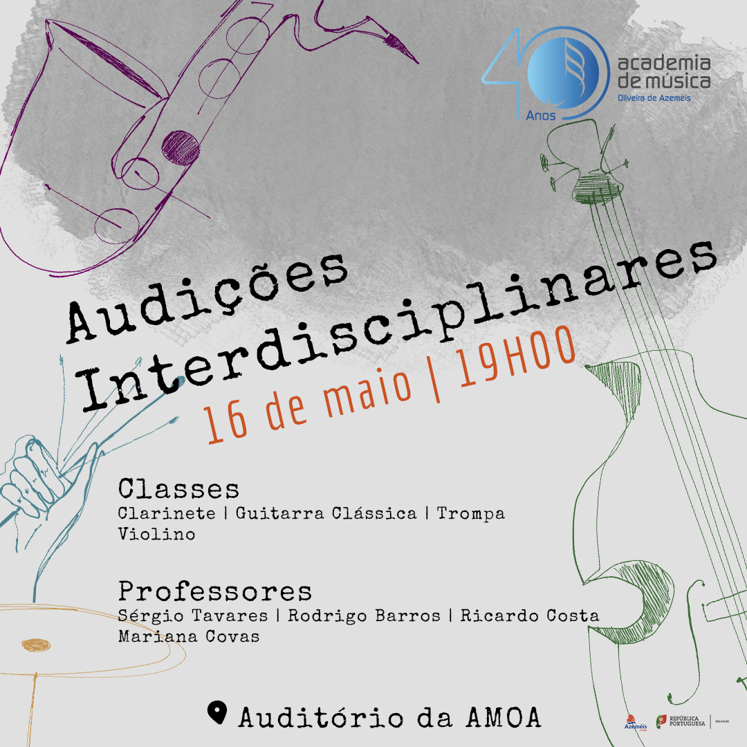 A segunda Audição Interdisciplinar do dia 16 de maio, decorre às 19H00 no Auditório da AMOA e conta com as classes de Clarinete, Guitarra Clássica, Trompa e Violino!