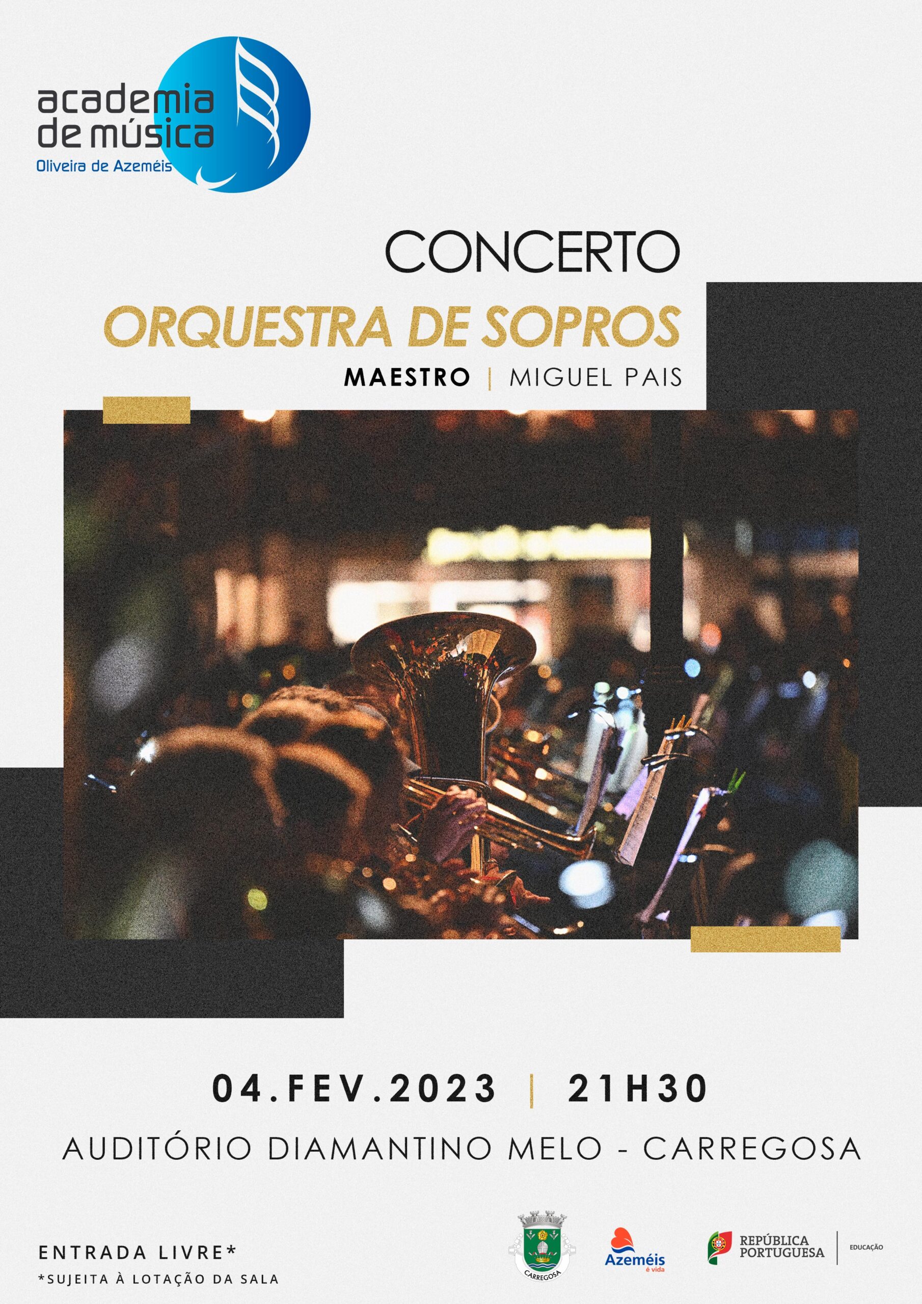 Auditório Diamantino Melo Rua do Centro Social, Carregosa, Oliveira de Azeméis, PortugalNo dia 04 de fevereiro de 2023, pelas 21h30, no Auditório Diamantino Melo, em Carregosa, terá lugar o Concerto de Orquestra de Sopros da AMOA. O concerto será dirigido pelo Professor e Maestro Miguel Pais. Um concerto a não perder! A entrada é livre, estando …
