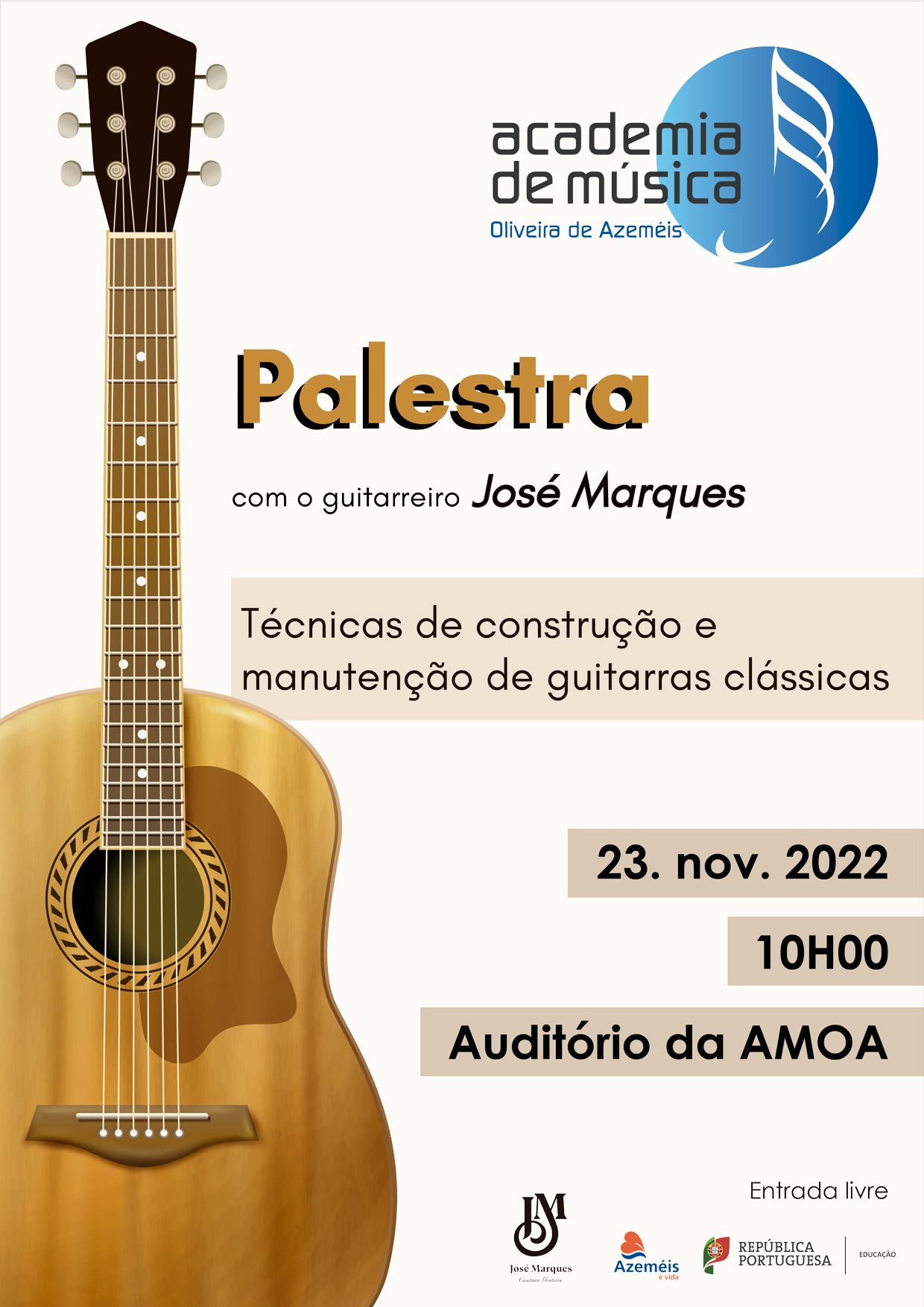 Academia de Música de Oliveira de Azeméis Avenida António José de Almeida, 249, Oliveira de Azeméis, Oliveira de Azeméis, PortugalA AMOA promove, no próximo dia 23 de novembro de 2022, pelas 10H00, uma palestra sobre técnicas de construção e manutenção de guitarras clássicas com o guitarreiro José Marques. Esta palestra tem como objetivo dar a conhecer o percurso percorrido na construção de uma guitarra, …