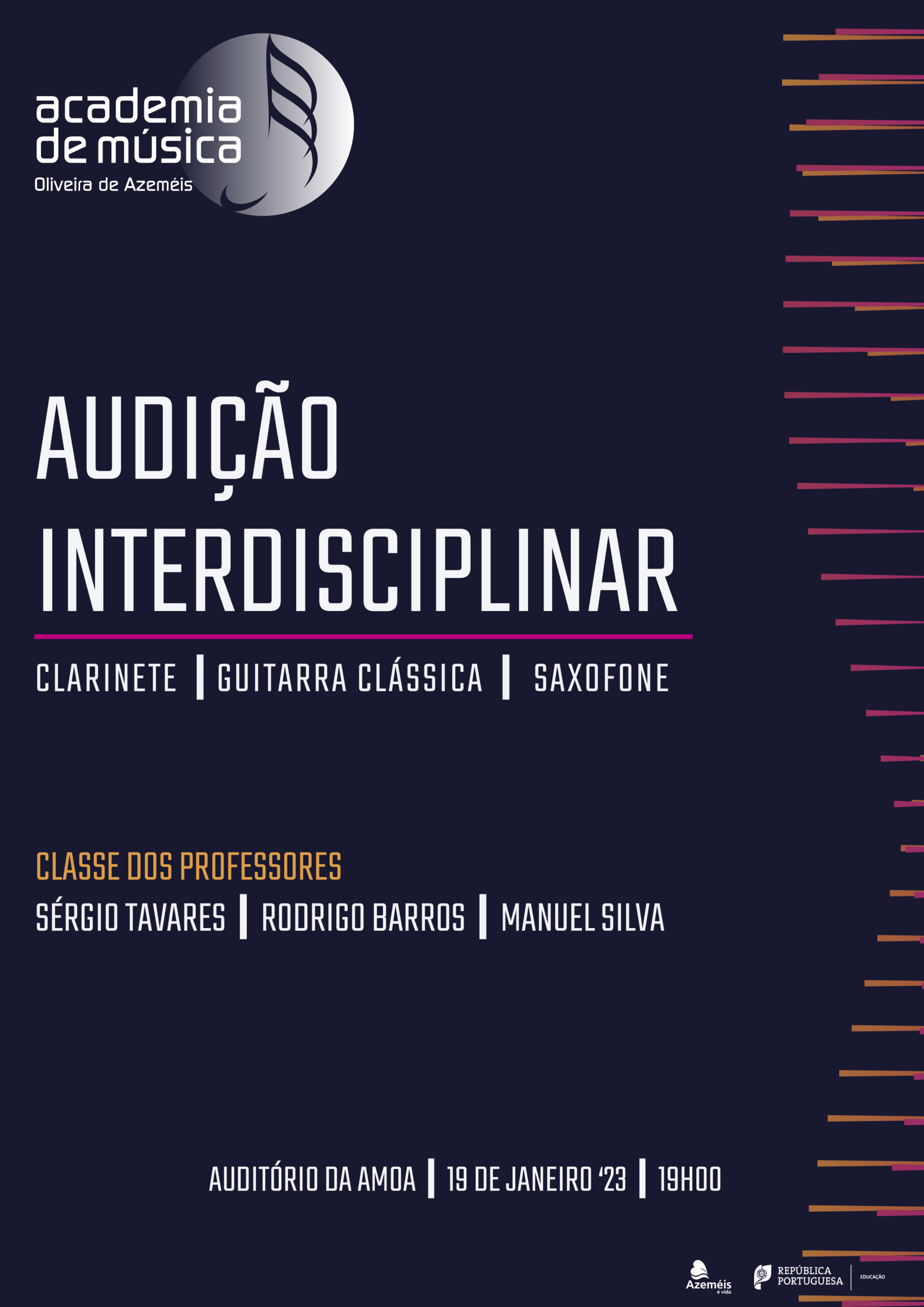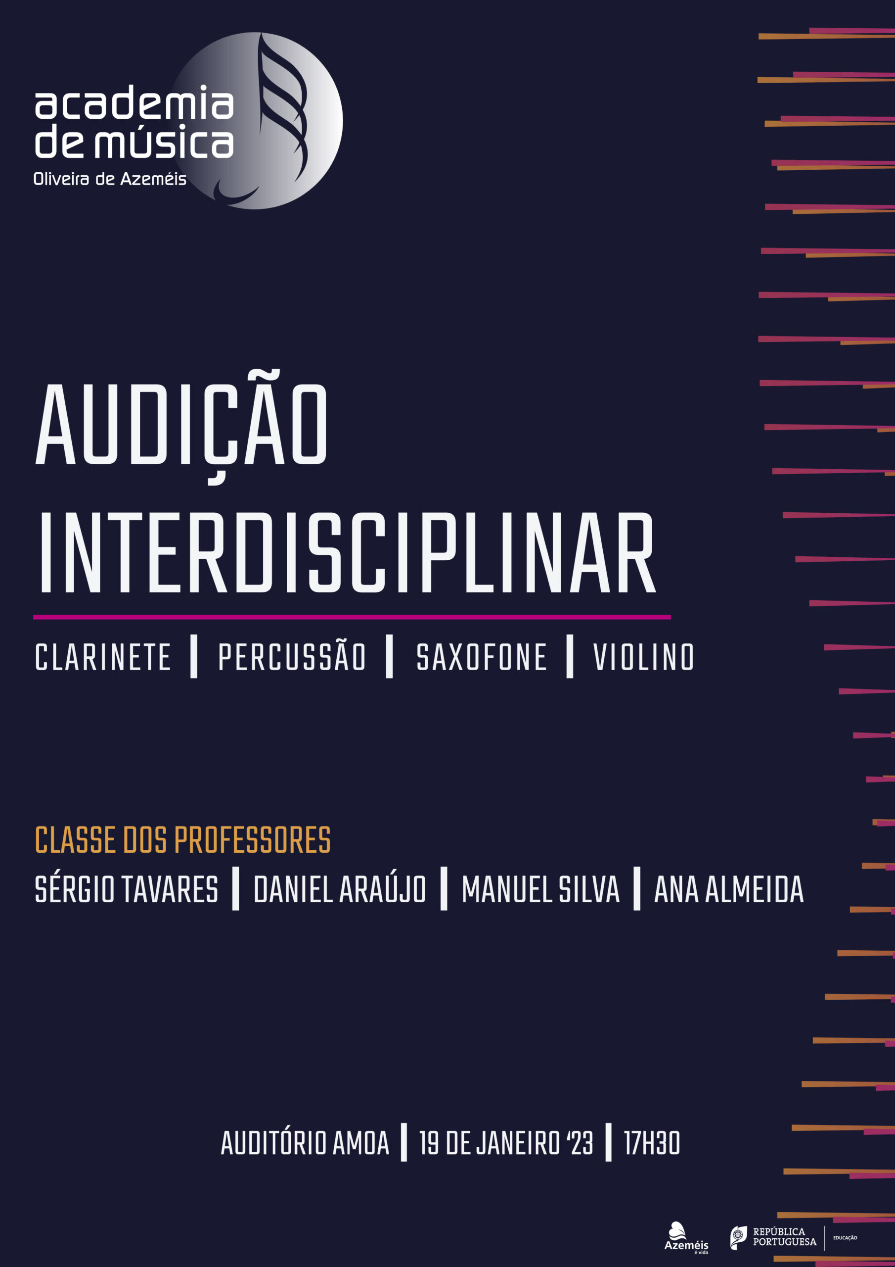 Academia de Música de Oliveira de Azeméis Avenida António José de Almeida, 249, Oliveira de Azeméis, Oliveira de Azeméis, PortugalDe 19 a 25 de janeiro de 2023, decorrem as Audições Interdisciplinares do 1.º Semestre! Este momento de avaliação é aberto ao público em geral. A Audição Interdisciplinar do dia 19 de janeiro de 2023, decorre às 19H00 no Auditório da AMOA e conta com …