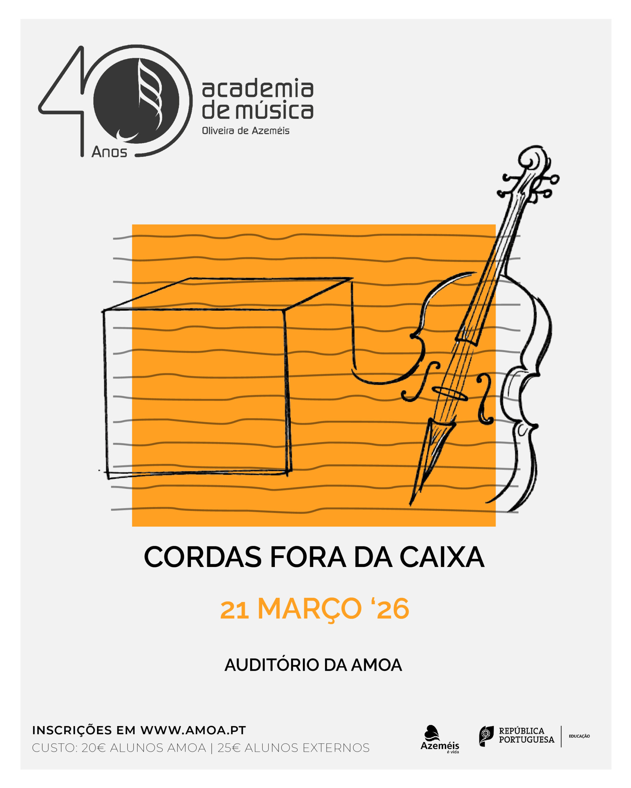 Está de volta mais uma edição do Workshop "Cordas Fora da Caixa"! Este workshop, destinado a alunos de Viola d'Arco, Violino, Violoncelo, Contrabaixo e Guitarra Clássica, acontece já no próximo dia 21 de março! Todas as informações e formulário de inscrição no nosso site, em …